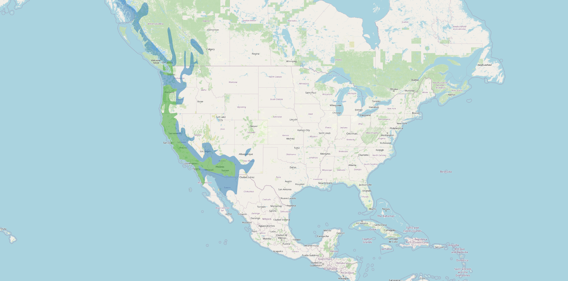 Range: Western North America from Baja California north through much of coastal and near‑coastal California and the Pacific Northwest to southern British Columbia, with inland expansion into the interior West.