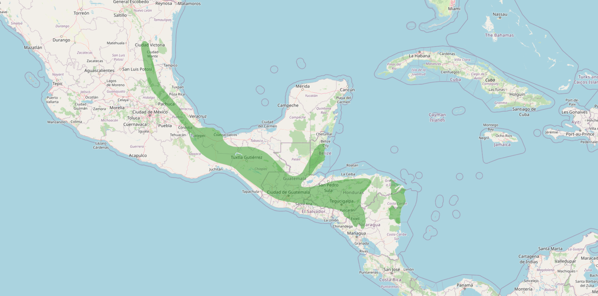 Range: Eastern and southern Mexico (including Veracruz, Oaxaca, Chiapas), Belize, Guatemala, El Salvador, Honduras, and north‑central Nicaragua.