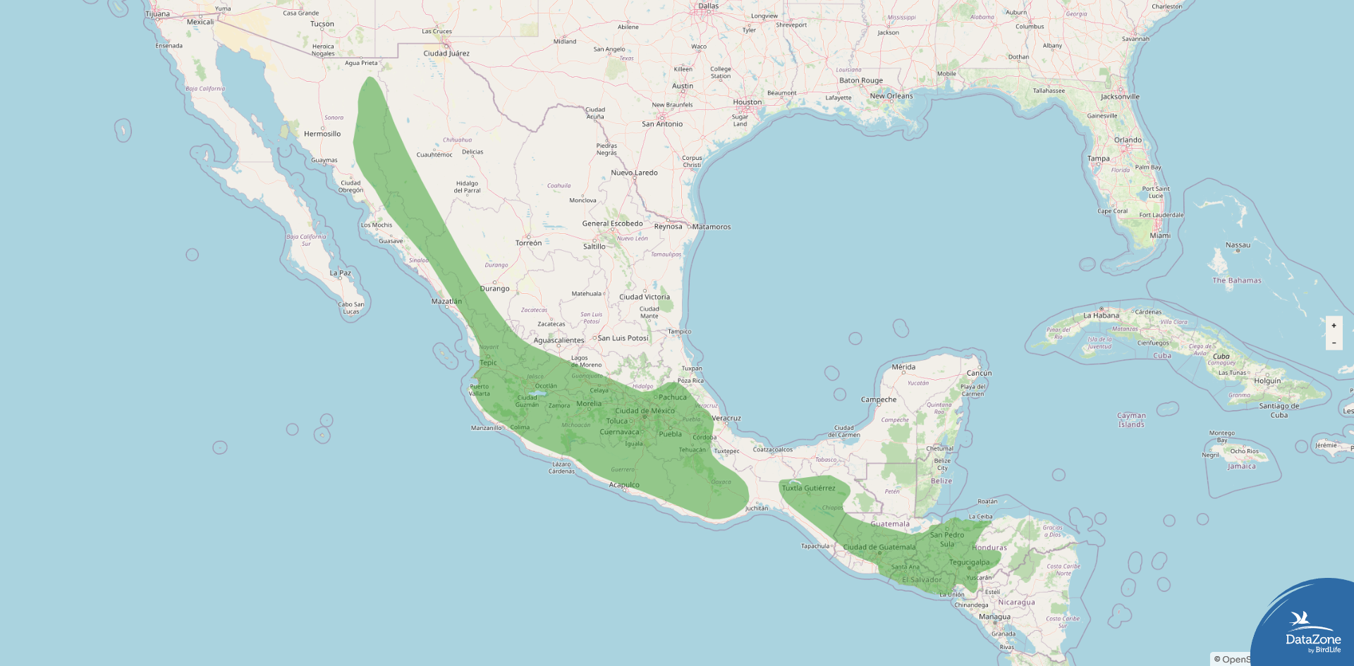 Range: Mexico (from Sonora and Tamaulipas south through Oaxaca and Chiapas), Guatemala, El Salvador, Honduras, and occasional vagrant to the southwestern United States (Arizona, New Mexico).Habitat: Dense oak and pine–oak forest, scrublands, deciduous and thorn forest, gallery forest, shady canyons, plantations, and parks and gardens.