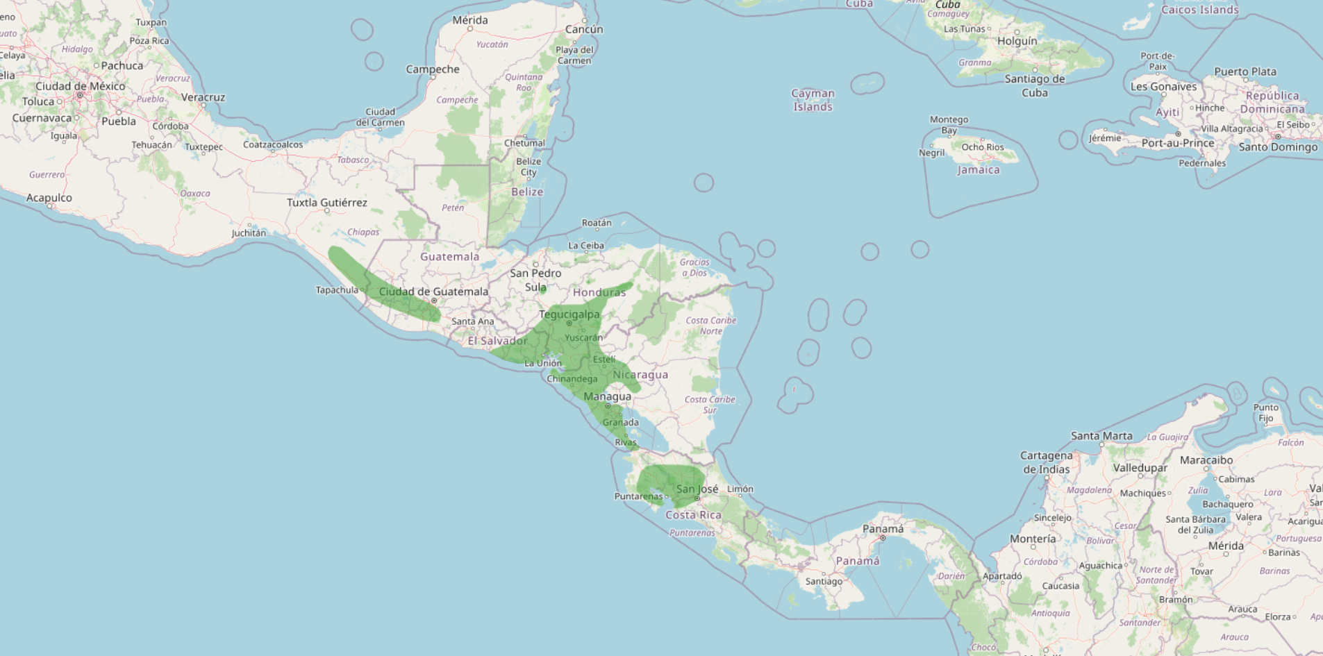 Elevation: About 100–1,800 m (330–5,900 ft) in Mexico and Guatemala, and from near sea level to about 1,200 m (3,900 ft) in El Salvador, Honduras, and Nicaragua; in Costa Rica mainly in the Pacific lowlands and foothills.
