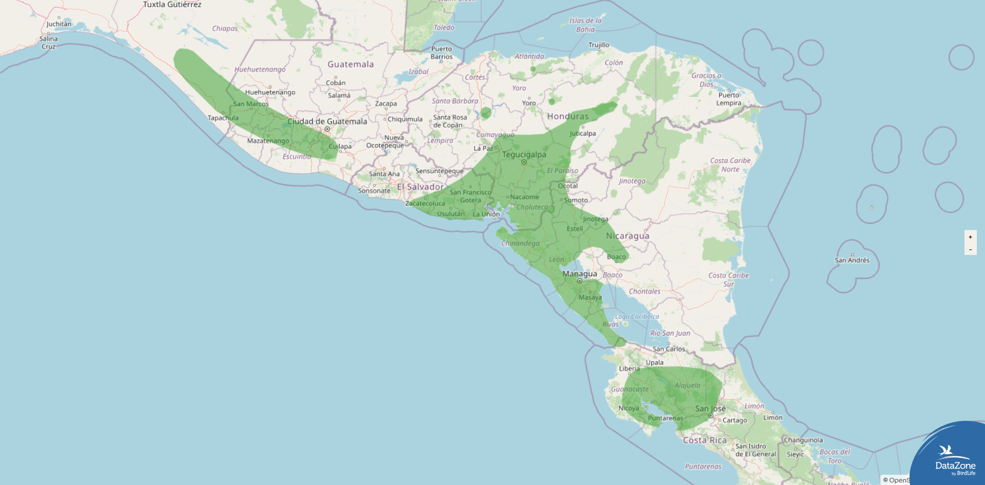 Range: Southern Mexico (southeastern Chiapas) south through Guatemala, El Salvador, Honduras, and northwestern Nicaragua to northwestern and central Costa Rica.