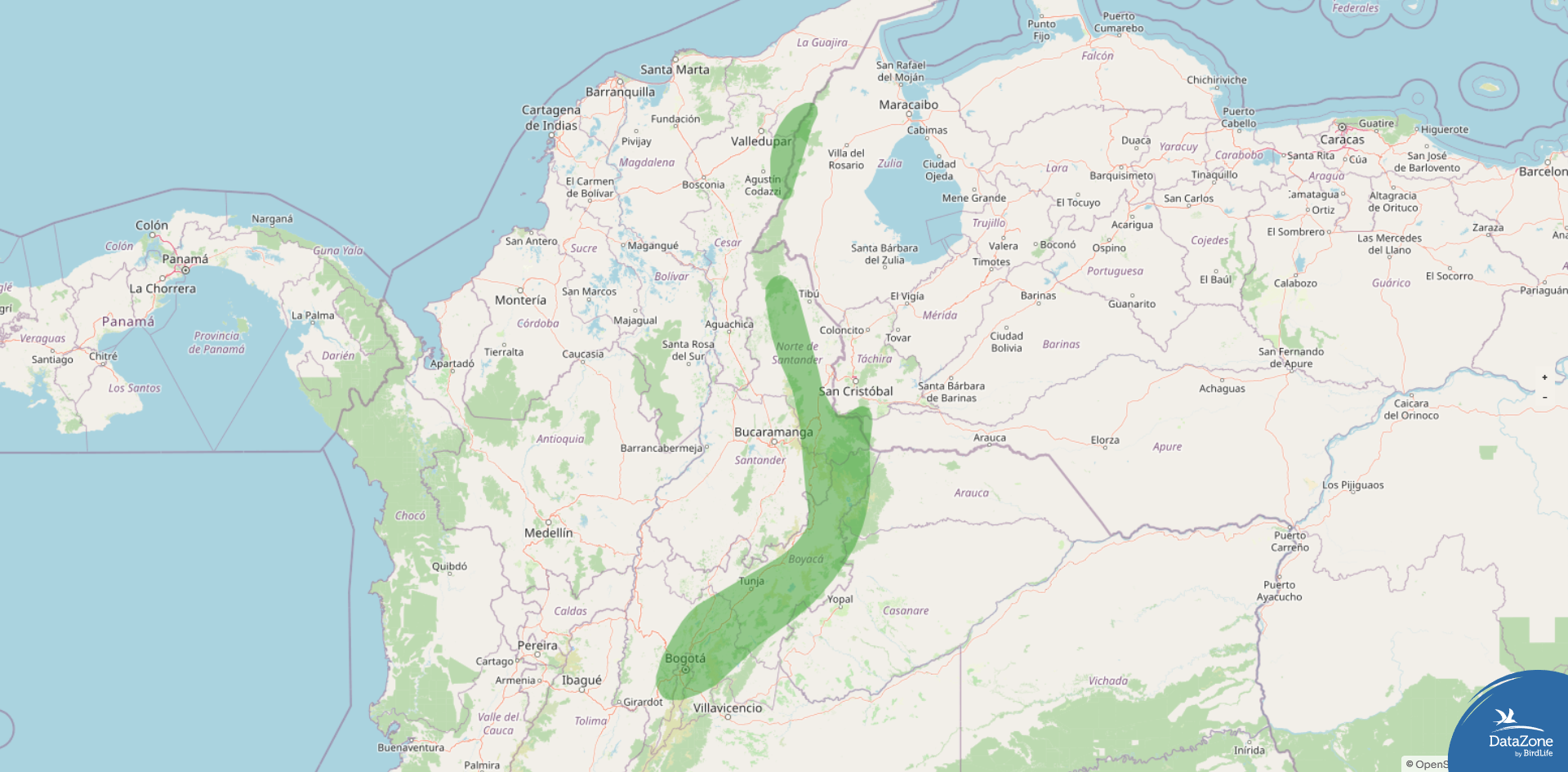 Overall, the species is confined to a relatively narrow Andean band in northeastern Colombia and far western Venezuela, occupying humid montane forest and associated shrubby habitats within this limited range.