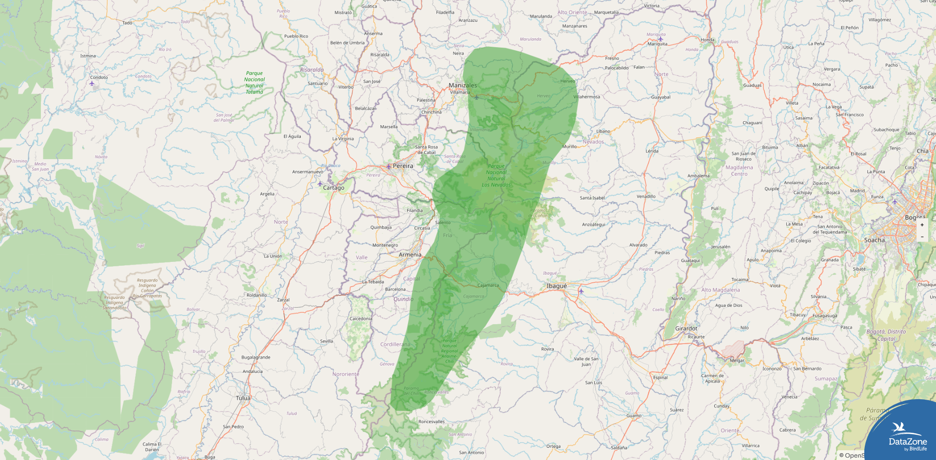 Distribution: Confined to the Central Andes of Colombia, centered on Nevado del Ruiz and adjacent páramo in Tolima and Caldas departments. It inhabits humid open páramo and rocky slopes between roughly 3,800 and 5,200 m (12,470–17,060 ft), favoring areas with abundant Espeletia rosettes.