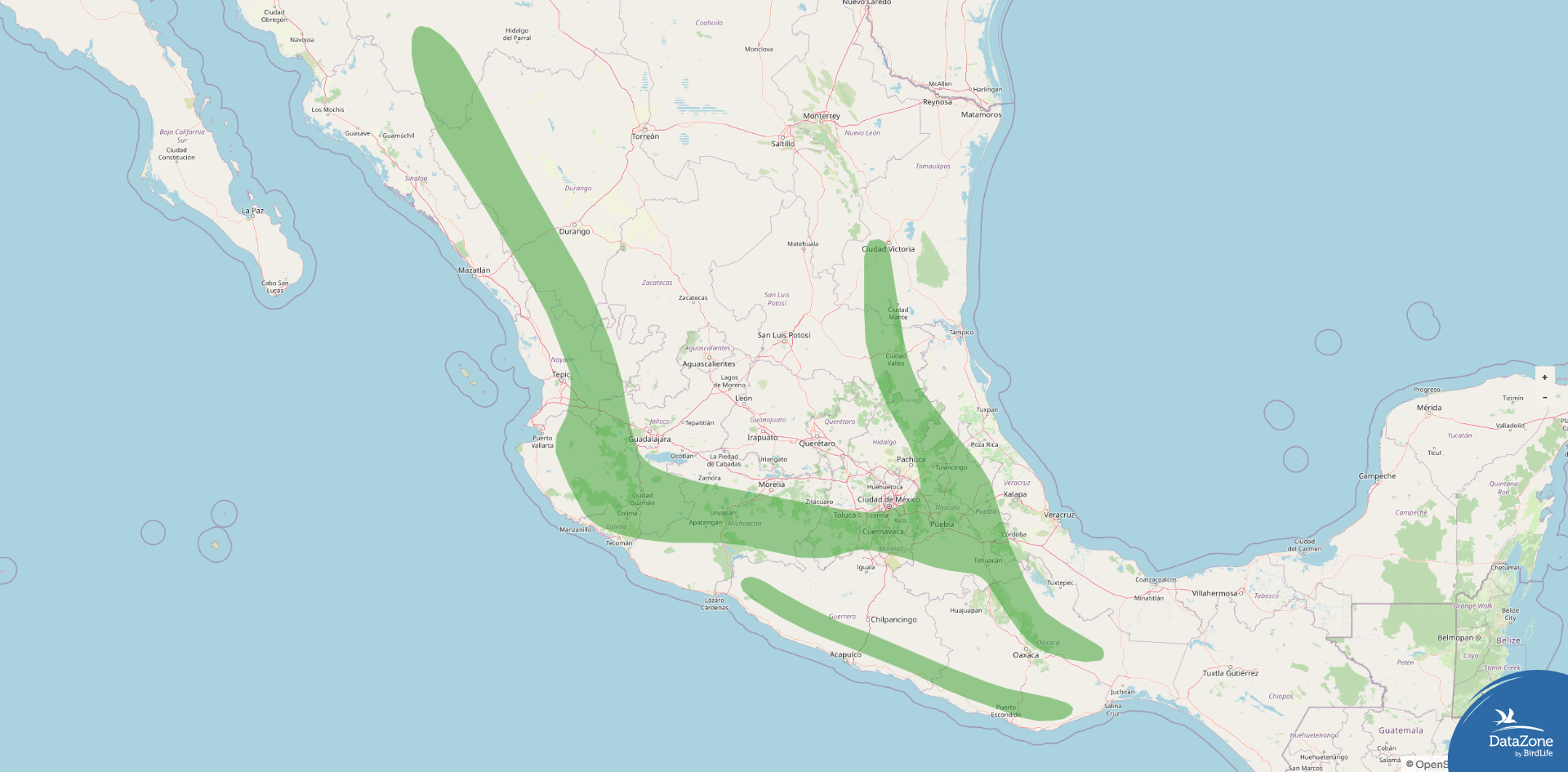 Range: Endemic to Mexico; found in both the Sierra Madre Occidental and Sierra Madre Oriental and south through highlands of central and southern Mexico, with very rare vagrants to Arizona, USA