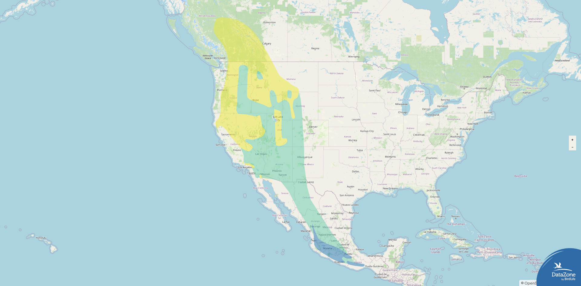 Range: Breeds in western North America from southern British Columbia and Alberta south through the northwestern U.S. into parts of California, Nevada, Utah, Wyoming, Montana, and Idaho; winters mainly in the highlands of western Mexico and locally into Central America