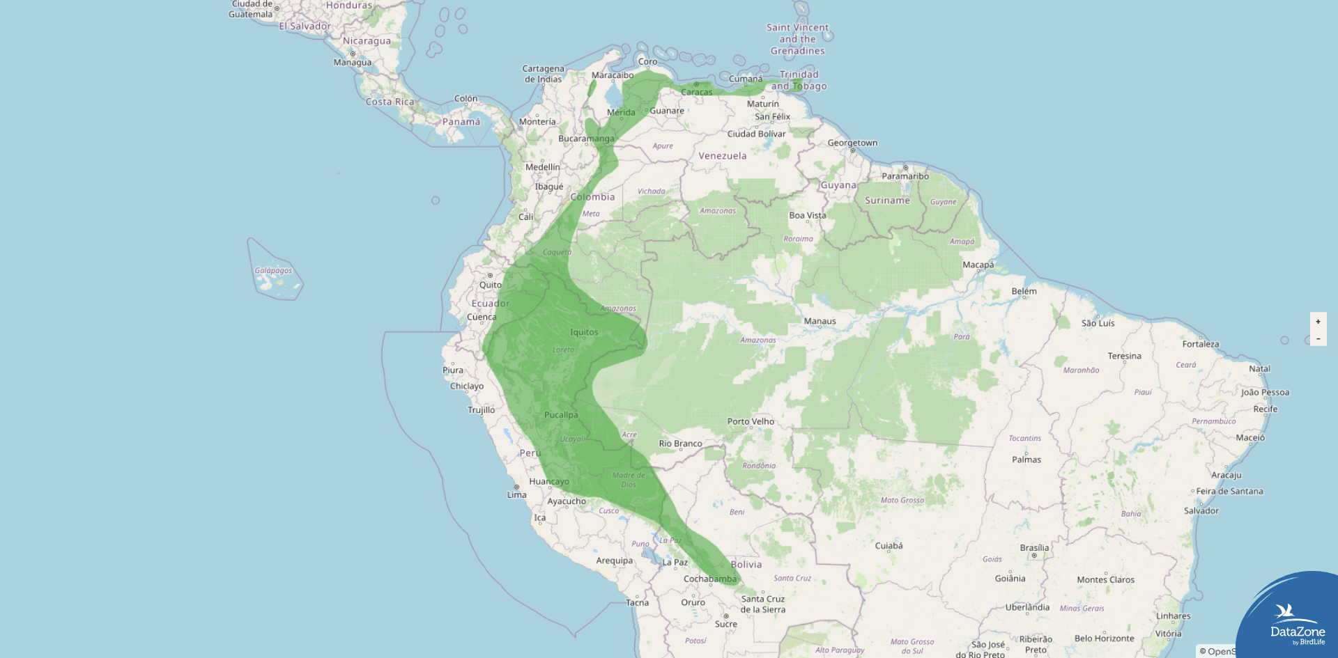 Range: From the Sierra de Perijá and northern and western Venezuela south through east‑central Colombia to eastern Ecuador, extreme northeastern Peru and adjacent western Brazil, across eastern Peru along the upper Amazon Basin and Andean foothills, and into northern Bolivia.