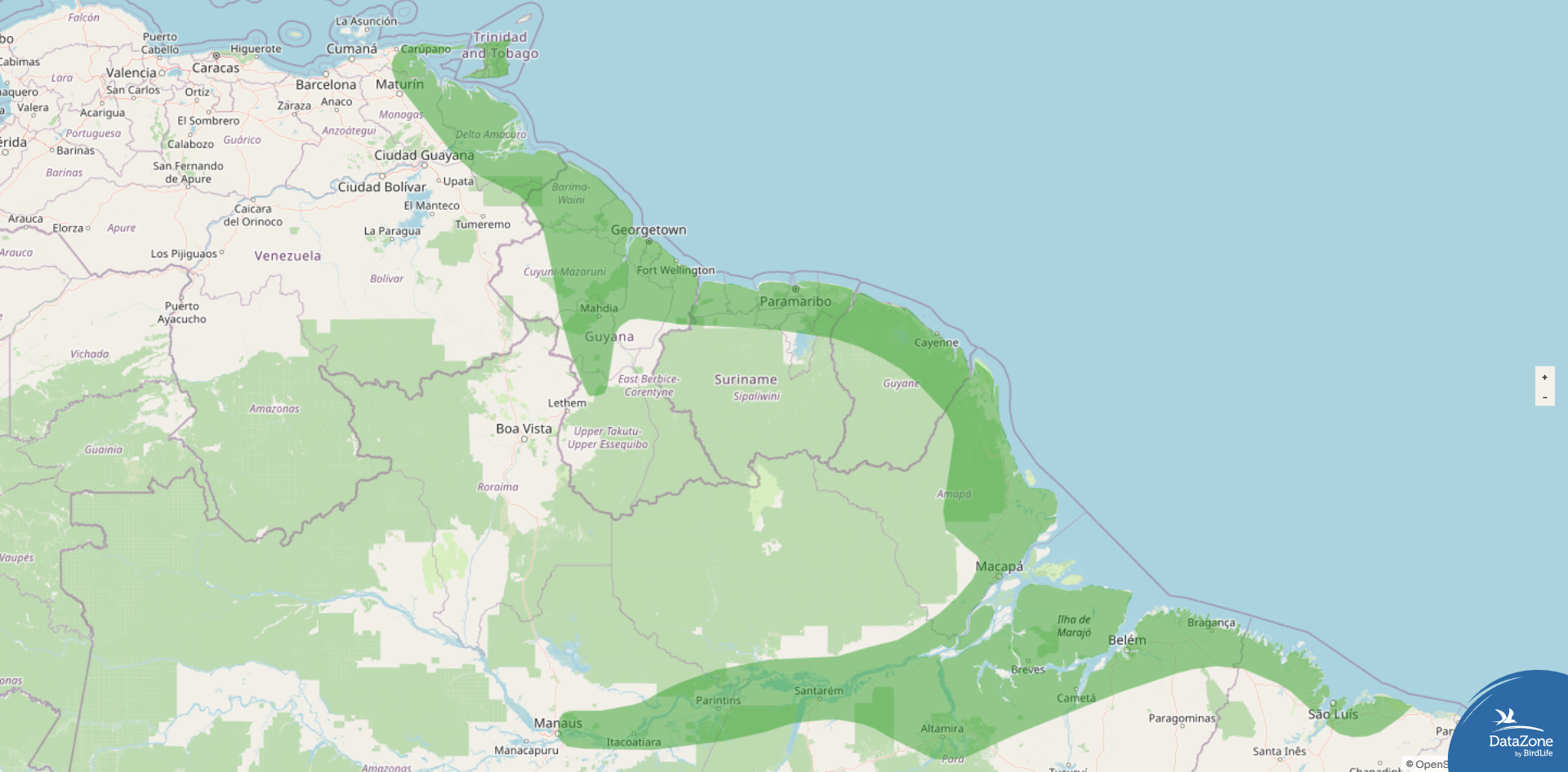 Range: Coastal northeastern Venezuela, Guyana, Suriname, French Guiana, and Brazil east to Maranhão, also along the Amazon River to the Negro River and on Trinidad (but not Tobago)