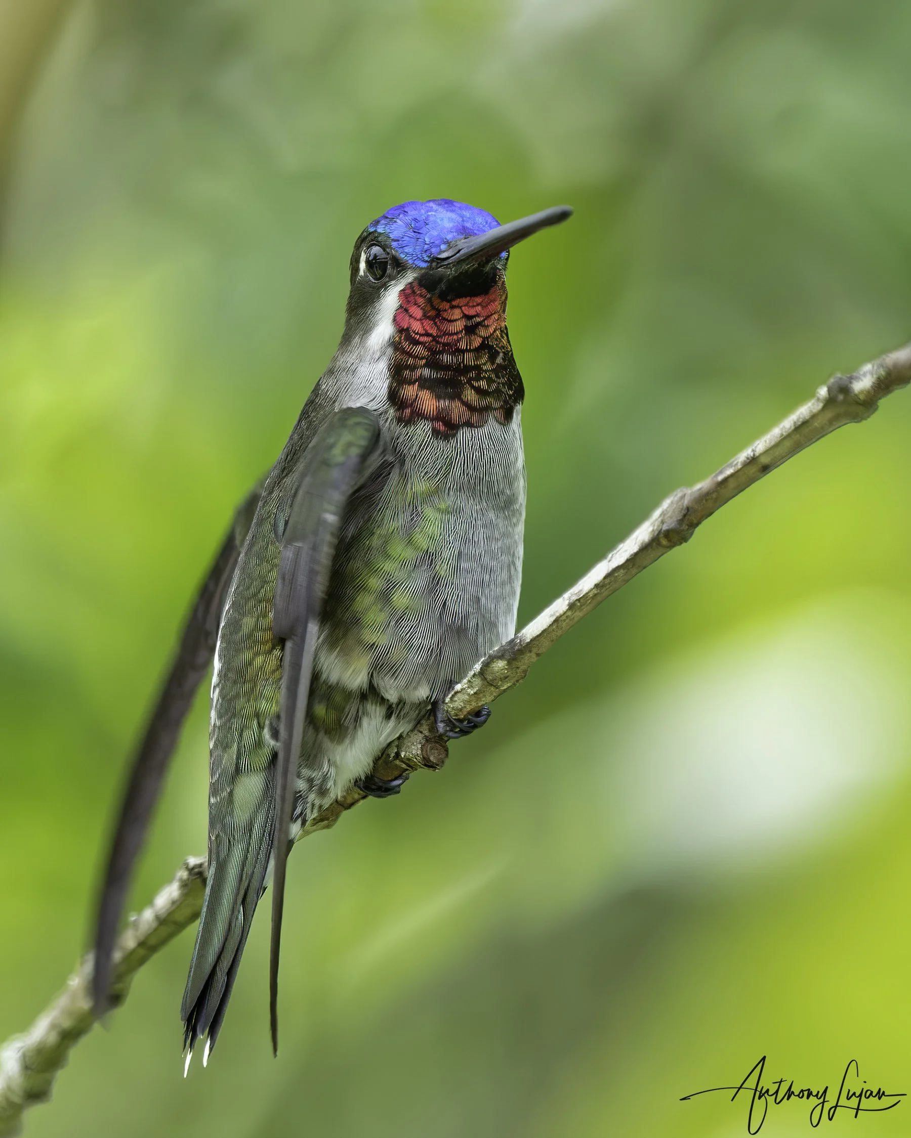 Adult males have a long, almost straight black bill and a small white spot behind the eye. The crown is shining bluish to greenish-blue, contrasting with bronzy-green upperparts. The chin is black, and the gorget is a dark metallic purple patch on the throat, sharply set off from the gray breast. The breast is gray with bronzy-green sides, and the lower breast and belly are dull white with gray undertail coverts edged whitish. The tail is moderately short, the feathers bronzy green near the body and black toward the tips, with the outer pairs showing white tips, giving a squared, white-tipped look in flight. In the field, males appear as long-billed, big hummingbirds with a bluish crown, purple “starthroat,” white eye-spot, and a dark tail with white tips.