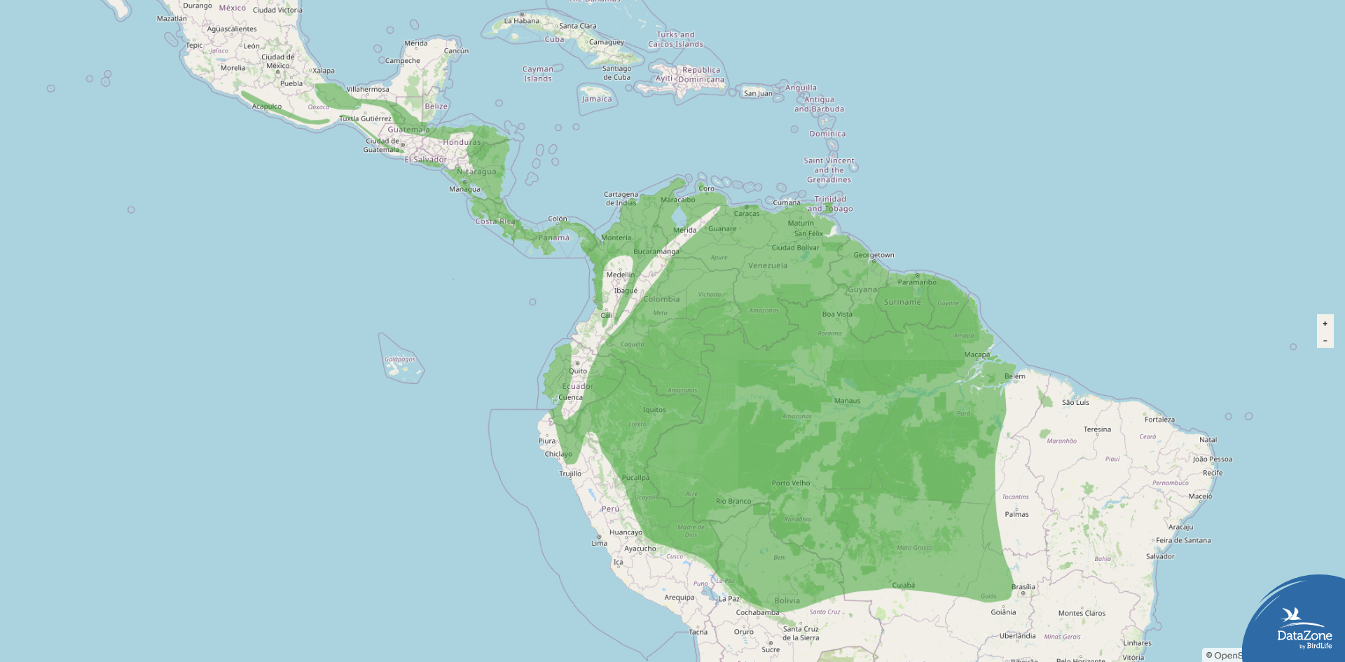 Range: Southern Mexico through Central America to Panama, then in South America from Colombia south and east through much of Amazonia into eastern Peru, eastern Bolivia, and central and northeastern Brazil, also on Trinidad and in the Guianas.