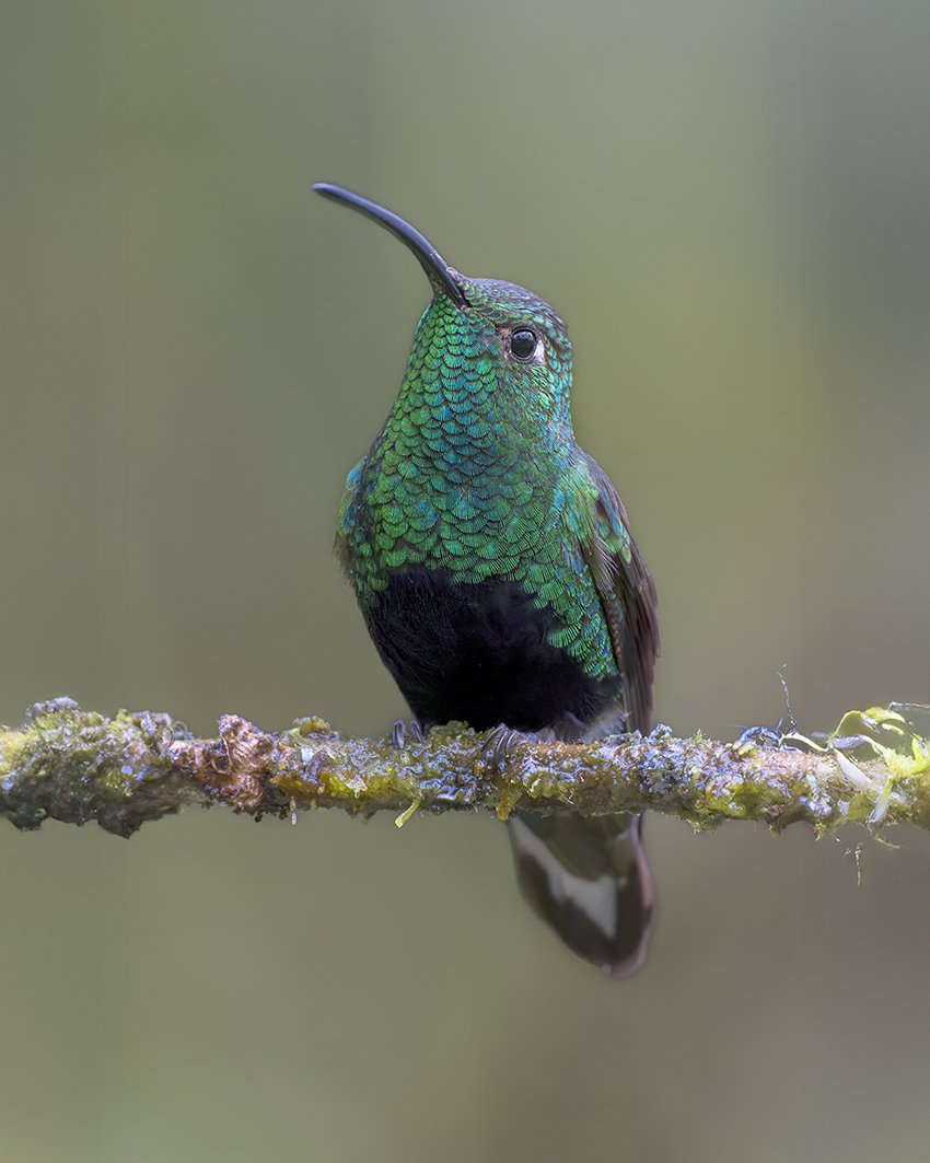 These individuals belong to the subspecies lafresnayi, which is distributed across the Eastern Andes of Colombia and adjacent areas of southwestern Venezuela. It occupies humid montane forest edges and shrubby slopes between 1,800 and 3,200 meters. This form is characterized by a medium-length decurved bill, green upperparts, and in males, a deep velvet-black belly contrasting with the emerald throat and chest. Females show spotted underparts and a less contrasting belly.