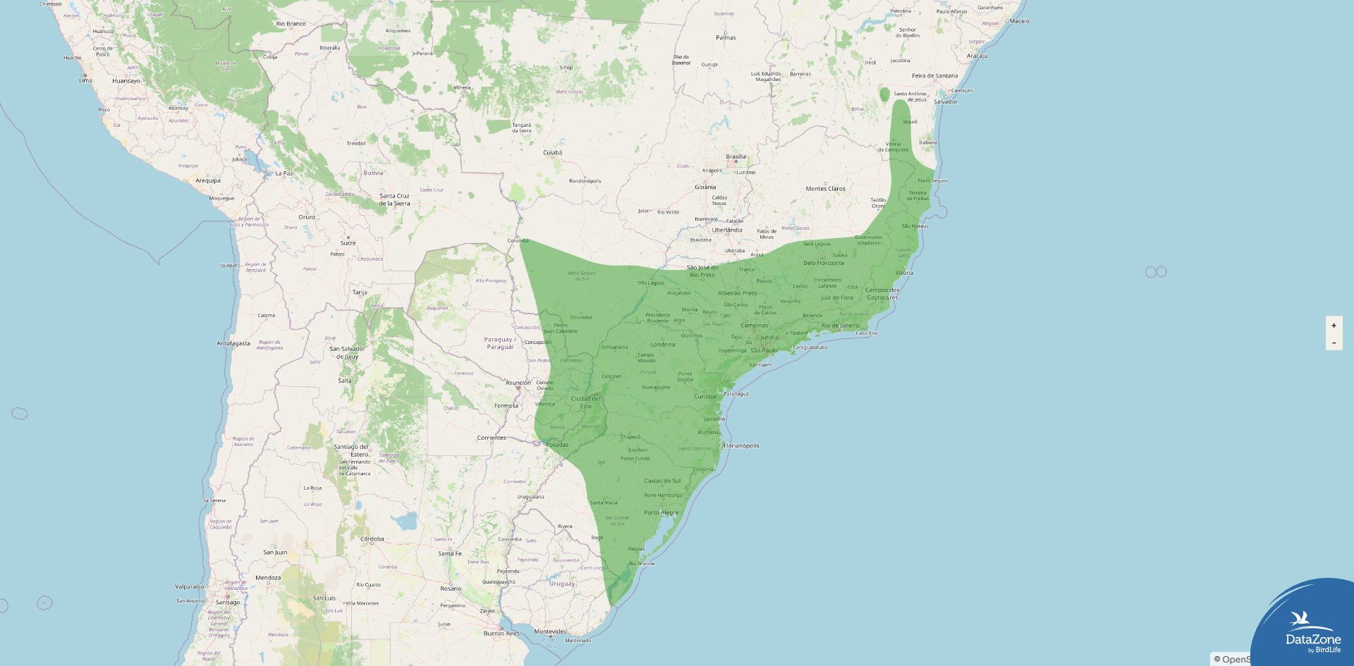 Range: Eastern and southeastern Brazil (Bahia and Minas Gerais south to Rio Grande do Sul and southern Mato Grosso do Sul), eastern Paraguay, northern Uruguay, and far northeastern Argentina (primarily Misiones).