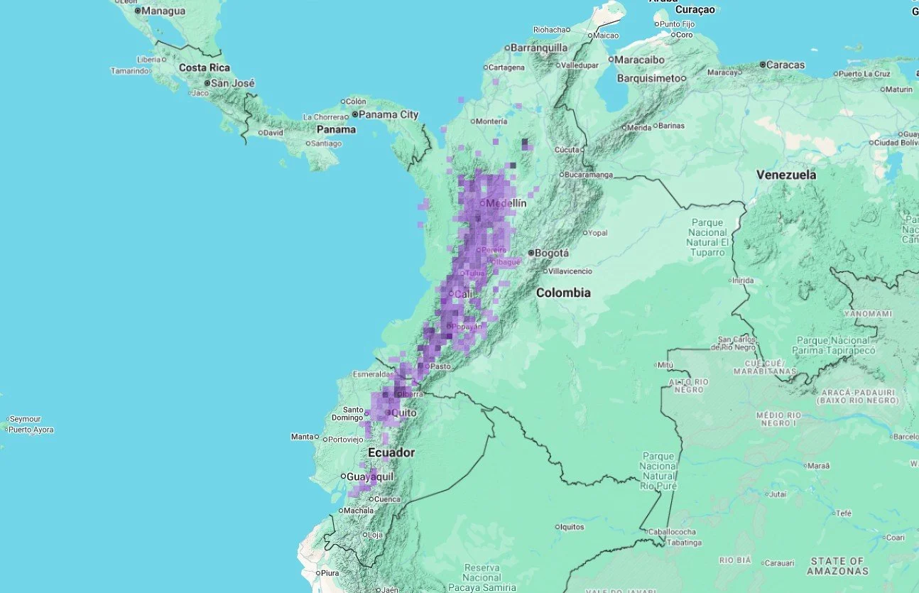 Range: Western Colombia and western Ecuador, from upper subtropical and temperate Andean zones down into arid and semi-arid tropical and subtropical lowlands and foothills.